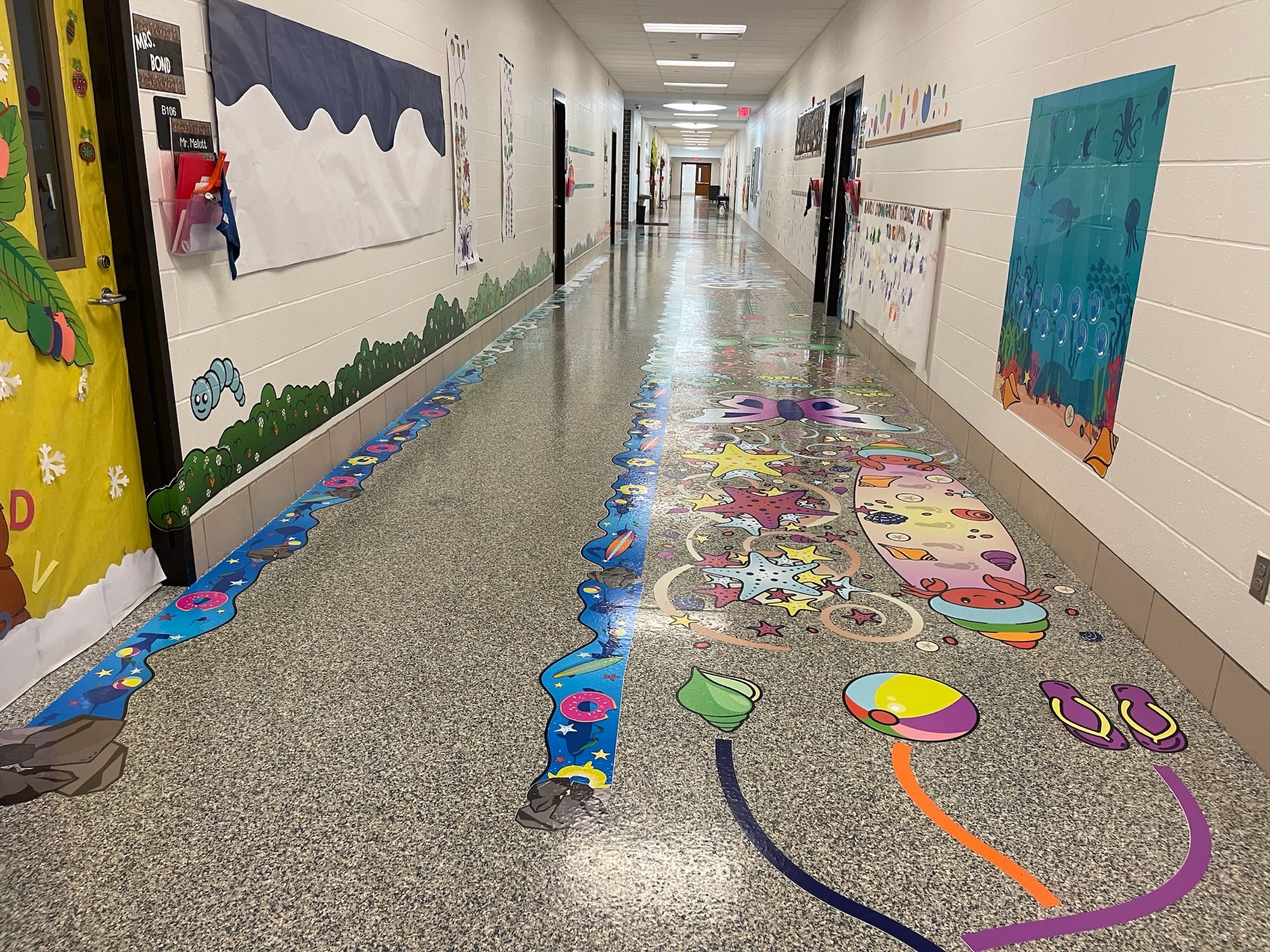 The hallway comes to life thru their whimsical graphics on the walls and floor that the students love to interact with to help with movement when the weather does not permit outside activities and helps with anxiety challenges throughout the school day. The path has been a wonderful addition to the Weirton Elementary Schools learning community. It is a wonderful collaboration project seeing younger and older students working together to develop a common goal.