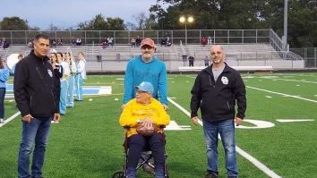 The Oak Glen Golden Bears presented retired Oak Glen Assistant Principal Bob Manypenny with a game ball at opening ceremonies to their Homecoming Game. Manypenny, a member of the first graduating class at Oak Glen in 1964, returned to teach at New Cumberland Jr. High upon graduating from West Liberty and continued his educational career at Oak Glen serving as Athletic Director and Assistant Principal.