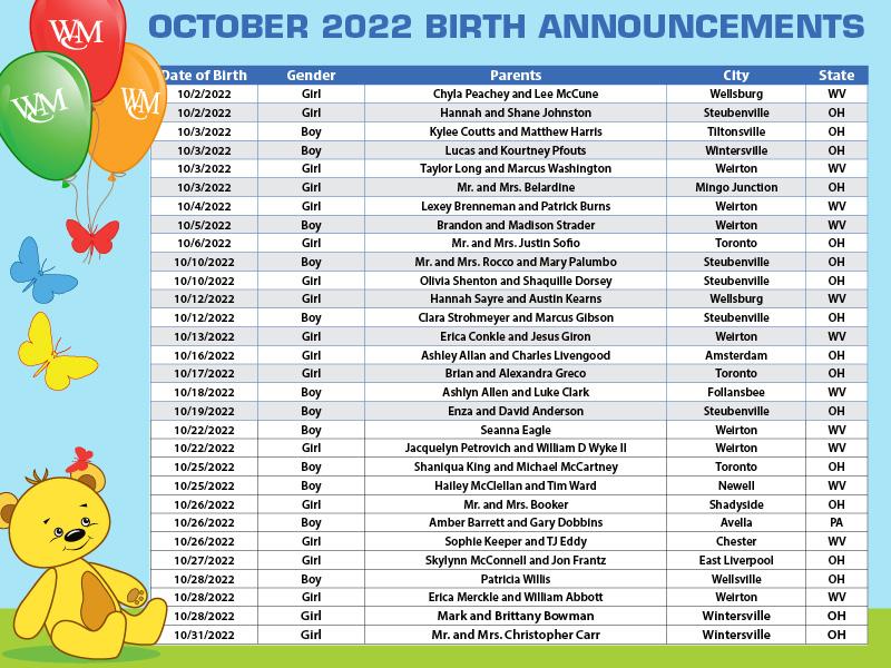 FeaturedWEIRTON MEDICAL CENTER OCT. BIRTHSNovember 7, 2022 Share on Facebook Share on X (Twitter) Share on Pinterest Share on LinkedIn Previous Post AND THEN AGAIN....by Tamara Pettit Next Post OBITUARY: THOMAS MATTHEW
