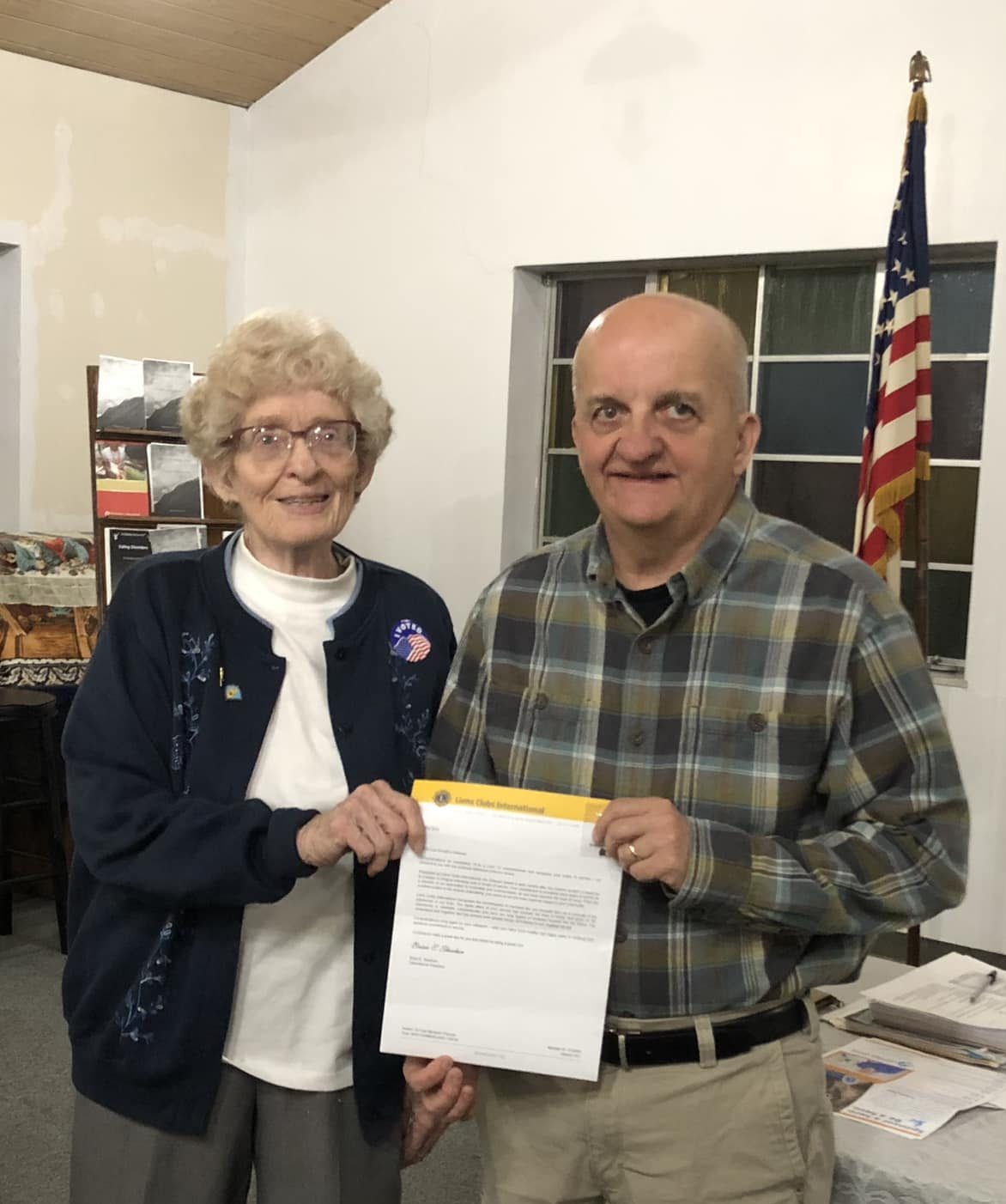 - President Dorothy Hawkes brought the meeting to order. Lion Rick Tinsky offered the prayer and Lion Bob McNeil led the Pledge of Allegiance. The minutes were accepted as read. Correspondence was received from the following: The Yellow Ribbon Girls thanked the club for the recent donation to Big Christmas Care Packages for the deployed troops; information from the Leader Dogs for the Blind as to how to support Symbolic Puppy Sponsorship; an invitation from the Top of WV to a member dinner; information from the New Cumberland Festival & Parade Committee on the Christmas Parade that will be held December 10, 2022; information from the New Cumberland Festival & Parade Committee about the sale of Janoski’s Poinsettias as a fundraiser for the committee; information from the Swaney Library regarding decorating Christmas trees for display through December. The treasurer’s report was placed on file for audit. Lion Alan Lee reported on the success of the Halloween party with 75 children attending along with their parents/guardians. The New Cumberland Lions Club has been invited to provide hot chocolate after the Christmas Parade as they did last year. Lion Jeanne Cox reported on her attempt to contact the Department of Highways to obtain information on Child Safety Seat Identification Stickers. She will send a sample sticker with a letter of explanation to entities in the area that serve children. Lion Patty Burgess will be decorating the Christmas Tree at the Swaney Library with the help of Lion Jeanne Cox. President Dorothy Hawkes presented Lion Don Deemer with a chevron for 10 years as a member of the New Cumberland Lions Club. There will be a Board meeting on November 15 at 6:30 p.m. in the Council Chambers. There will be NO meeting on November 22 as this is Thanksgiving week. The next regular meeting will be the Christmas Party on December 13 and the only meeting in December. Lion Bob McNeil made a motion to adjourn with a second by Lion Lee Allman.PHOTO: President Dorothy Hawkes, leftr, presents Lion Don Deemer with a 10-year membership chevron