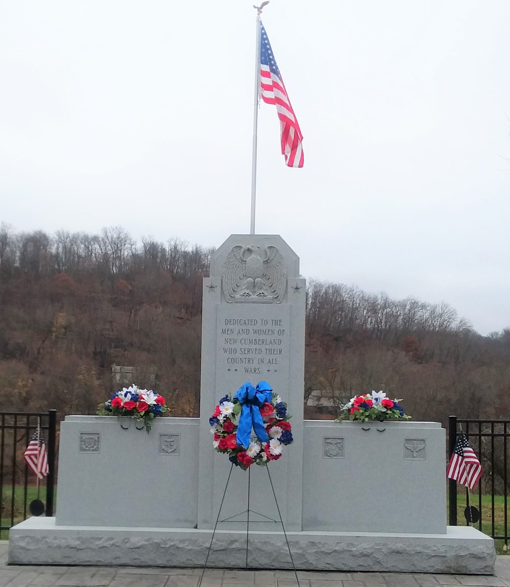 The New Cumberland Community Projects Committee has recently made some updates to the monument located next to the Swaney Library on Court Street. The makeover began with the removal of old trees and brush behind the granite marker. A professional monument cleaning company then cleaned the stone, and a new cement pad with stamped stones was added across the front. Along the back of the marker, three flag poles were added, and new wrought iron fencing was installed on both sides of the monument. Additional fencing on top of the hill behind the memorial is scheduled for spring. Permanent dusk to dawn lighting was also added. Monies for this project came from a grant from the Pugliese Foundation from Steubenville and a donation from the state that was delivered to the committee by State Senator Ryan Weld. The monument was dedicated on November 11, 1957, and was paid for by local citizens with a fund raising campaign.