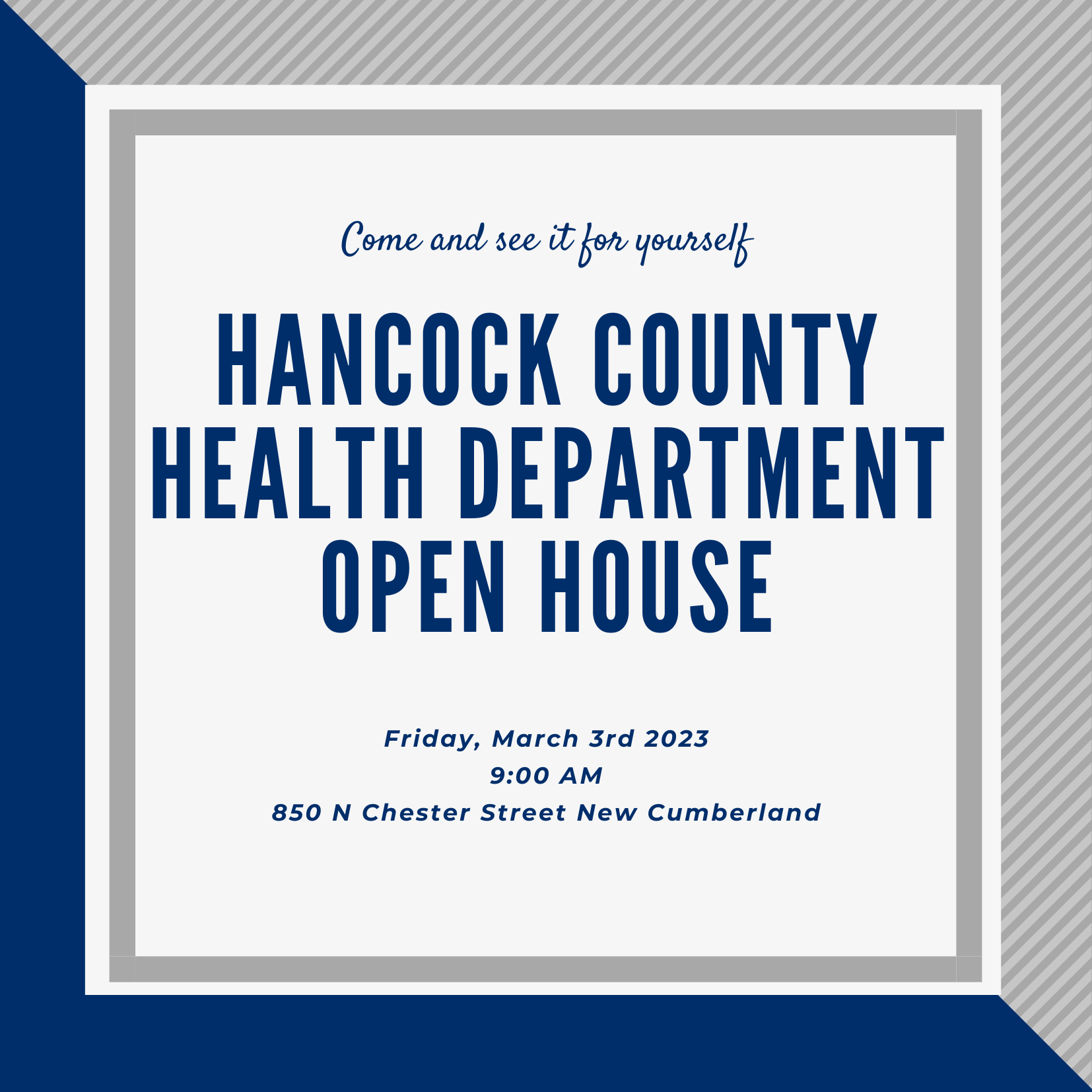 You are invited to the Hancock County Health Department Grand Opening/Open House celebration on March 3rd at 9:00am at our new facility. The address is 850 N Chester Street New Cumberland, WV. United States Senator Shelley Moore Capito will be in attendance. There will be commemorative mugs, light snacks and beverages provided. We hope to see everyone there!
