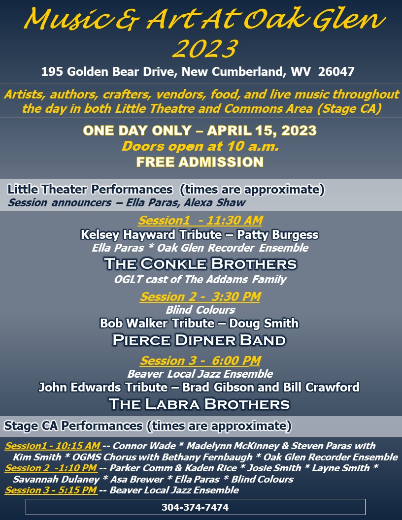 NewsMusic & Art ScheduleApril 9, 2023 Share on Facebook Share on X (Twitter) Share on Pinterest Share on LinkedIn Previous Post MOUNTAINEER CASINO HELPS WITH ADOPT-A-HIGHWAY Next Post AND THEN AGAIN.......By Tamara Pettit
