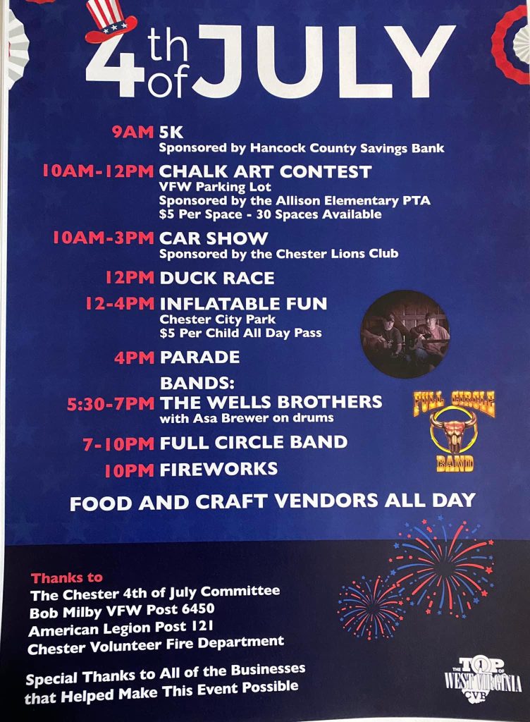 It wouldn’t be the 4th of July, without a parade and the Chester Parade will start at 4 p.m. with line-up at 3 p.m. Following the parade bands will provide entertainment including FULL CIRCLE & BON JOURNEY. The day’s festivities conclude when the sky lights up with the FIREWORKS DISPLAY.